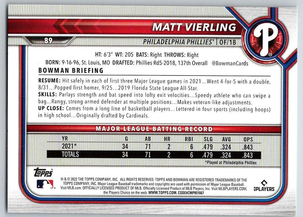 Matt Vierling 2022 Bowman # 89 RC Philadelphia Phillies